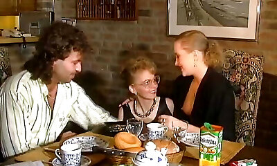 2 stunning German chicks sharing a loaded man rod on the kitchen table
